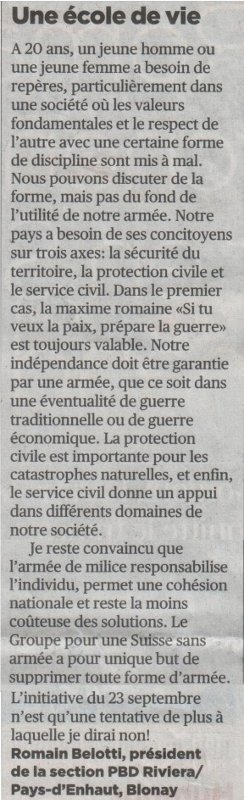 Un article paru dans le Courrier international du 14 septembre dernier est intitulé «Pour moins faire la guerre, rétablissons le service militaire obligatoire». Il rappelle comment, depuis l'Antiquité, seule l'intégration d'un peuple dans son armée en garantit le contrôle démocratique et regrette que des pays comme la France, la Grande-Bretagne et même les Etats-Unis n'aient pas eu l'intelligence de conserver l'obligation de servir. Pour nos jeunes et pour nous-mêmes, ne commettons pas l'erreur de jeter aux oubliettes un système flexible, économique et, surtout, dans les mains de son peuple.